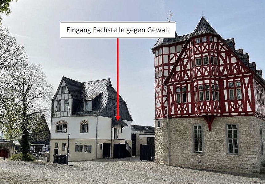 - Das zweite große Tor auf der linken Seite führt zum Hof des Bischofshauses. Die Fachstelle gegen Gewalt sitzt im linken Fachwerkhaus. Gehen Sie die Treppe an die Haustür nach oben und klingeln Sie bei Fachstelle gegen Gewalt.