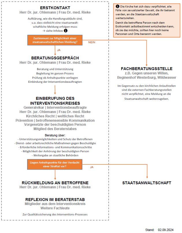 Ein so genannter Interventionskreis beschäftigt sich unter dem Vorsitz des Generalvikars mit den Vorwürfen. Der Interventionskreis leitet eine Untersuchung ein und beschäftigt sich auch mit der Frage der Konsequenzen für den Täter oder die Täterin