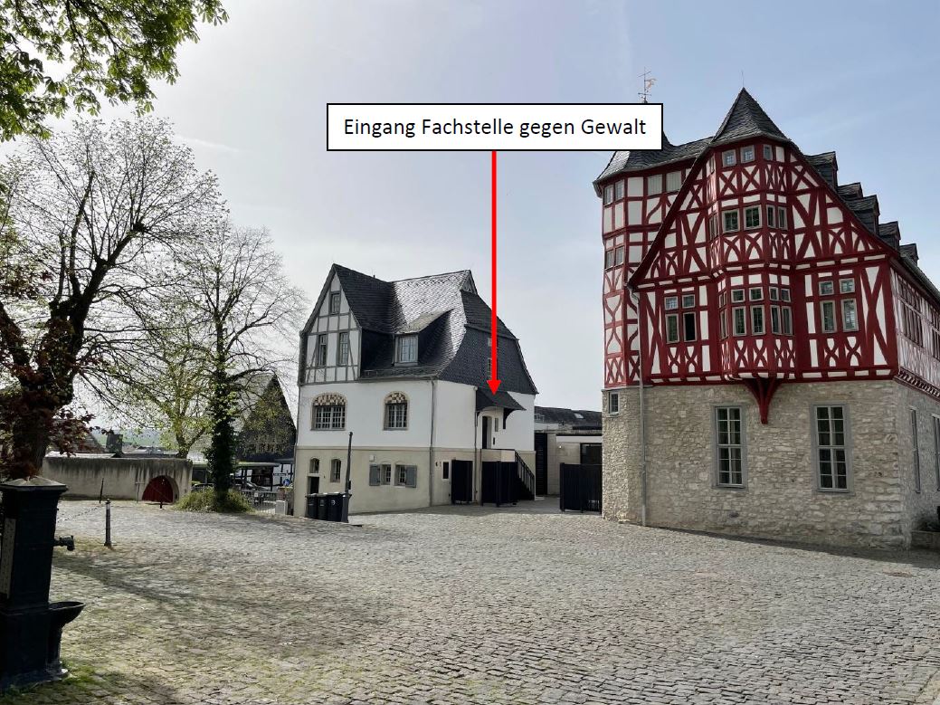 - Das zweite große Tor auf der linken Seite führt zum Hof des Bischofshauses. Die Fachstelle gegen Gewalt sitzt im linken Fachwerkhaus. Gehen Sie die Treppe an die Haustür nach oben und klingeln Sie bei Fachstelle gegen Gewalt.